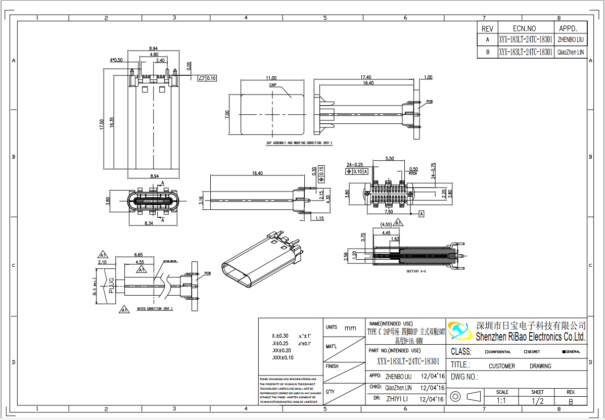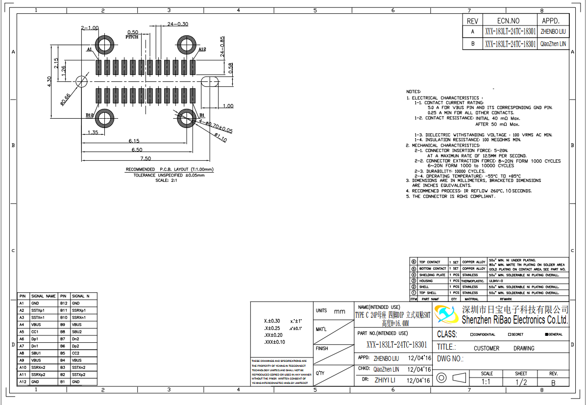 TYPE C 24P母座 沉板2.0MM 雙排SMT CH=0.7MM L=8.58MM(小米MX2/8SE尾插接口)