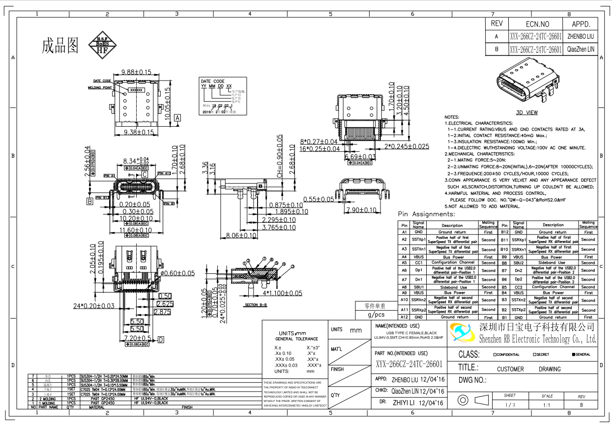 TYPE C 24P母座 沉板1.8MM 雙排SMT 帶雙耳螺絲定位孔 L=9.2MM(小米4C/樂(lè)視S2尾插接口)