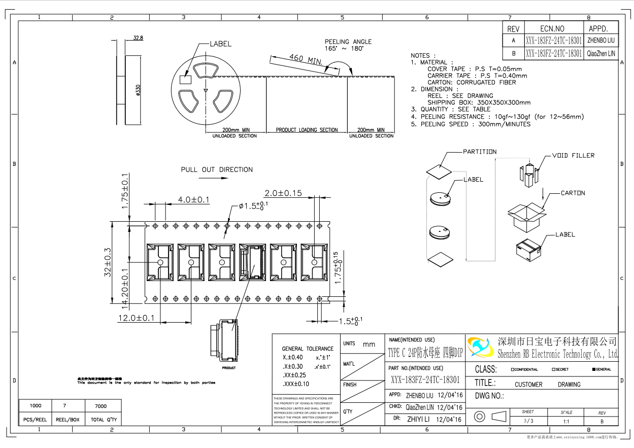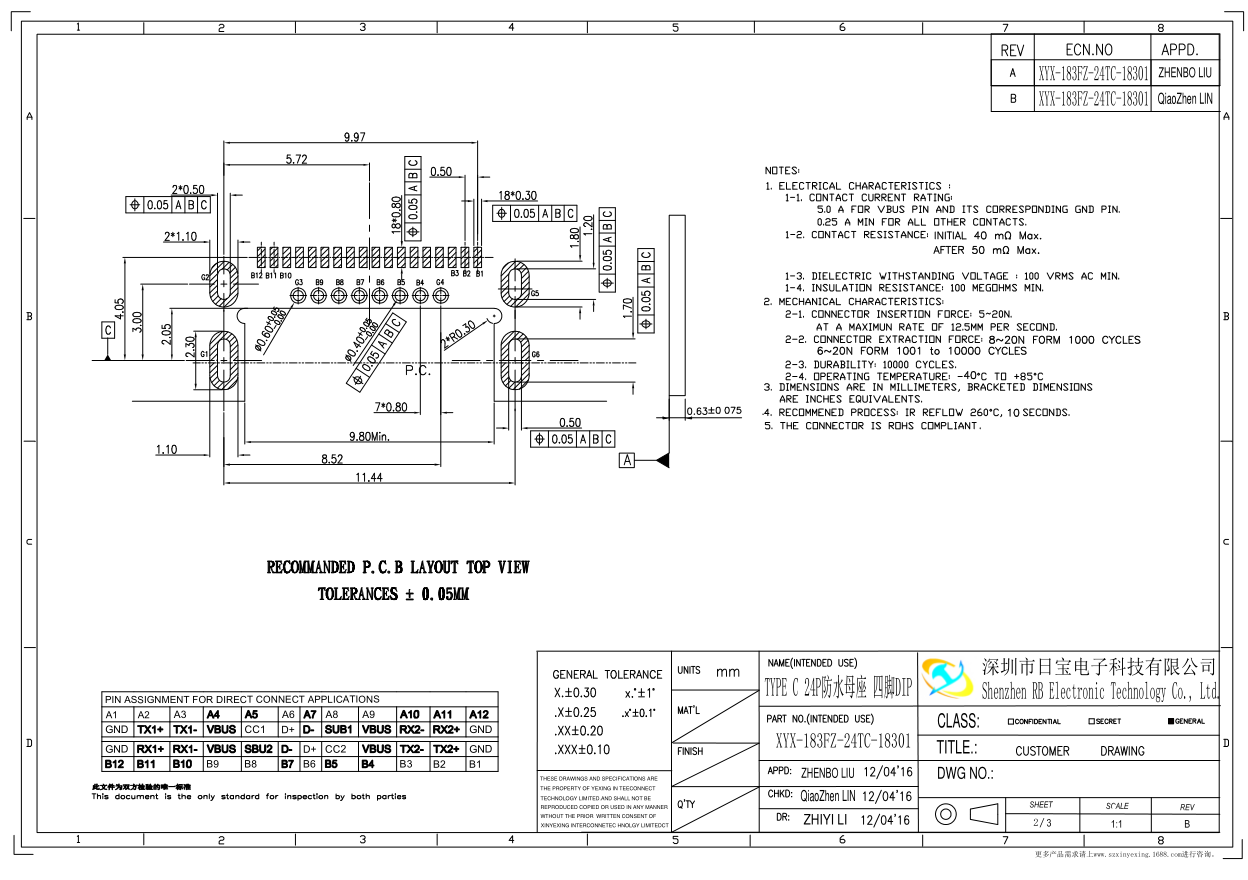 TYPE C 24P母座 沉板2.0MM 雙排SMT CH=0.7MM L=8.58MM(小米MX2/8SE尾插接口)